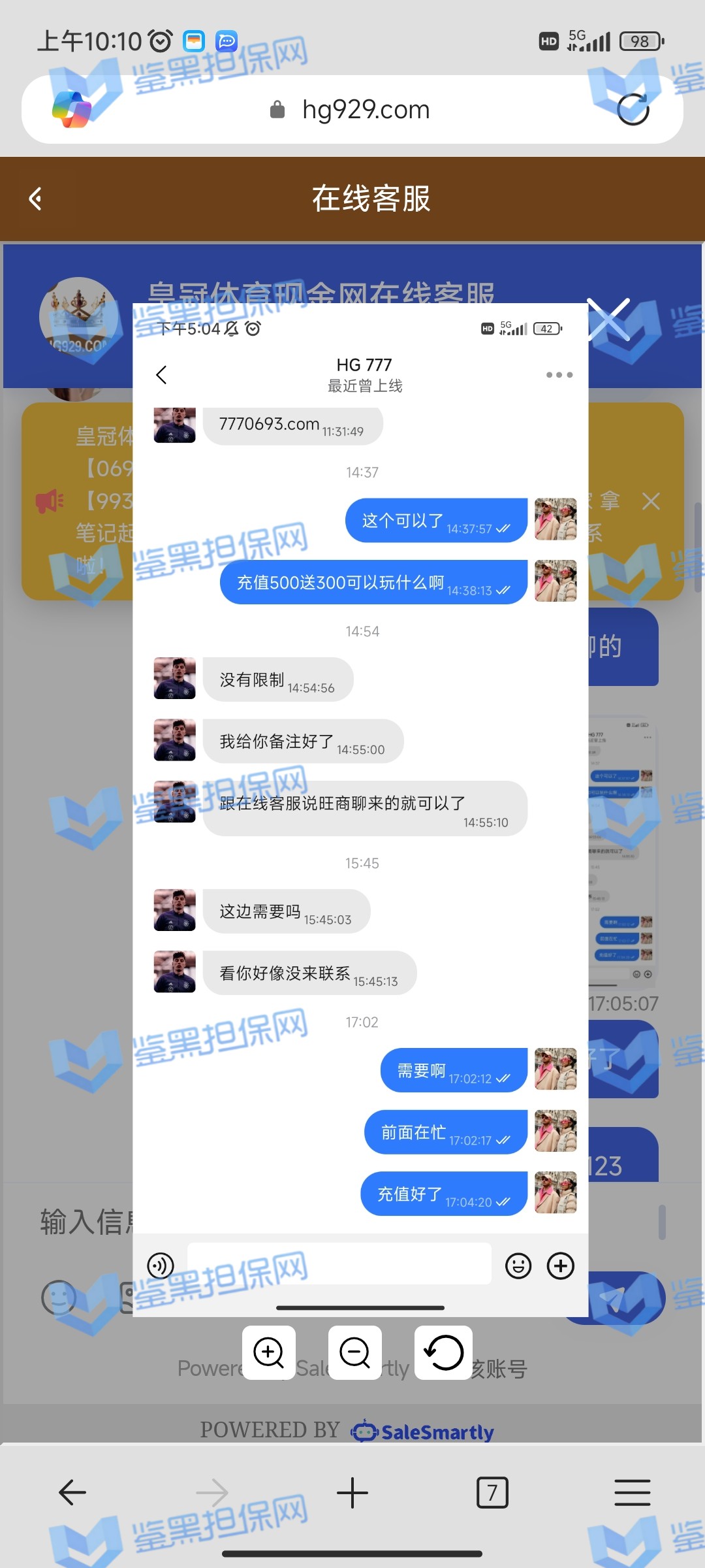 一开始我是在旺旺之前有加过旺旺的客服然后那天过后好久发了一个活动。存款500元送300元 2倍流水 然后我就充值了 然后让我找在线客服 然后呢就是当时提现过一次300元 没有到账隔天退回来了 然后我就想着是限制提现多少嘛。然后我又去娱乐了。打到1500多了。然后申请提现现在一直都没有到账 然后旺旺客服就给我说 你充值了500 我说对 然后就一直没有理我把我删除了 我一直找在线客服。客服是一个信息也不会回 也不知道平台是没有在线客服还是怎么了 旺旺客服号是41257454