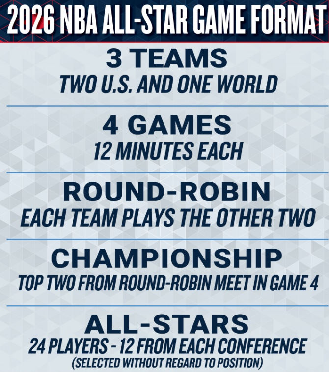 2026年NBA全明星赛将首次采用全新的“美国队对阵世界队”赛制,赛事共设三支球队。其中两支球队由美国本土球员组成,第三支为国际球员组成的世界队。