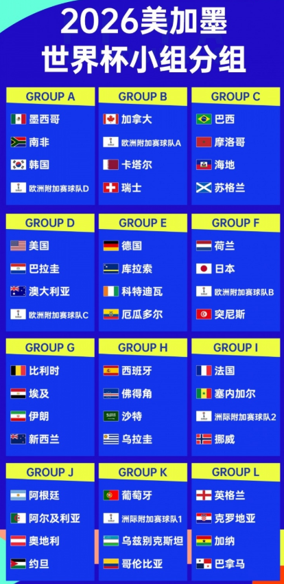 2026美加墨世界杯分组形势揭晓,四年一度的盛宴前菜丰盛,48强的命运齿轮已经开始转动。本次抽签几乎没有制造出真正意义上的“死亡之组”,诸强将在小组赛阶段完成热身,为淘汰赛做准备。